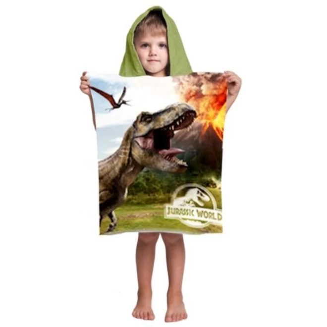 Heerlijke velours Dinosaurus badponcho. Op de voor- en achterkant van deze Jurassic World badcape staat een T-Rex. Ideaal na het badderen of als je uit de zee of het zwembad komt. Hup, je hoofd door de opening en je wordt in een mum droog en bent tevens beschermd tegen felle zon.
