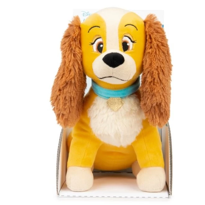 Heerlijk zachte pluche Lady knuffel met geluid. Deze Disney hondenknuffel, uit de serie Lady en de Vagebond, heeft een afmeting van ca 30 cm en is heerlijk knuffelbaar. Als je in lady’s voorpootje knijpt hoor je 3 verschillende geluiden: een leuk accordeon muziekje, honden geblaf en een zielig hondengeluidje.