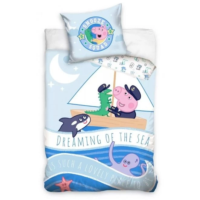 Onder dit mooie Peppa Pig George Sailing dekbedovertrek valt je kleine schat met een glimlach in slaap. Het Peppa Big dekbedovertrek wordt geleverd met bijpassende kussensloop en is dubbelzijdig te gebruiken.